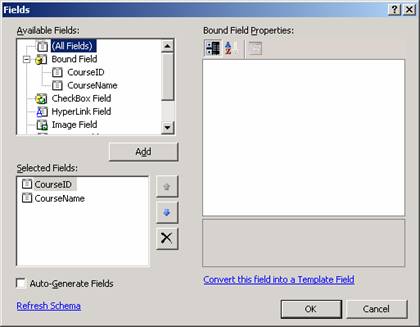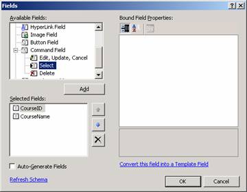 12. Select the GridView control and in the Properties window, be sure its DataKeyNames property is set to CourseId.