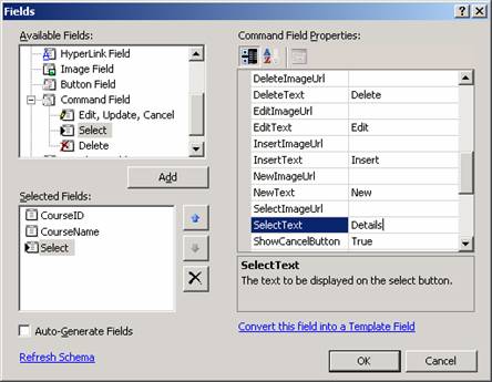 9. In the Selected Fields list, select the new button and then in the property grid, set its SelectText property to Details.