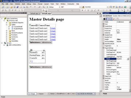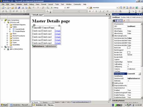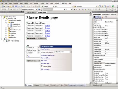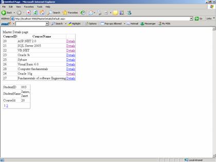 Data from related tables can be displayed on one page. The master table data is displayed in a grid and users can select individual rows. When they select a row, one or more details of records are displayed I a scrollable control elsewhere on the page. We shall use the StudentMaster as the master table and the CourseDetails as the details table.
