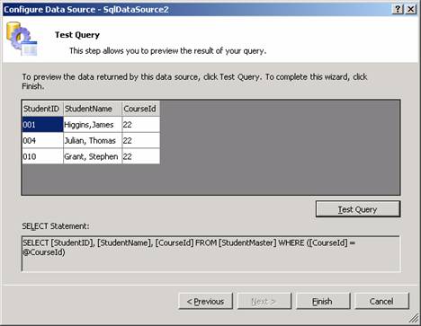 3. The DetailsView control displays a Student record associated with that CourseId.
