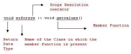 It is not always the case that the member function declaration and definition takes place within the class itself. Sometimes, declaration of member function alone can occur within the class. The programmer may choose to place the definition outside the class. In a situation such as this, it is important to understand the identifying member function of a particular class. This is performed by using the operator :: this is called scope resolution operator.