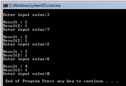When the program begins, the value of static variable a is initialized to zero. The value of the input in is 3 (which is not equal to zero) and is then passed to the function in variable x. The variable a is incremented thus making a as equal to 1, thus, the return of value from function exforsys( ) for the first time is 1, which is printed in the called function.
