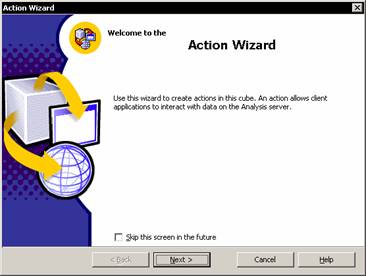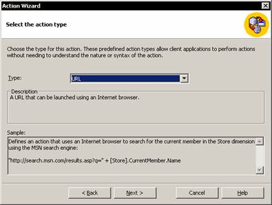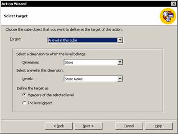 1. Target: The user is prompted to select the object to which the action is to be attached. The end user will be able to see the action when he selects the object to which the action is attached. Actions can be attached to Cubes, Dimensions, members in a dimensions, levels, members in a level, Cells or named sets.