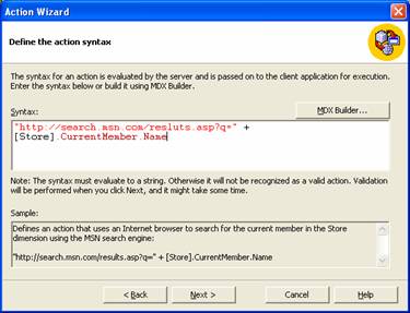 3. Next the user is required to select the syntax for the action by specifying parameters that are passed when the action is executed. The syntax may evaluate to a string or can be included as an expression written in Multidimensional expressions(MDX).
