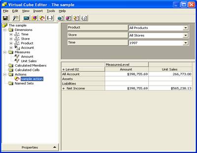 Note that Actions in virtual cubes are not visible in the Analysis Manager tree pane. To create and access them, you must first display Virtual Cube Editor.