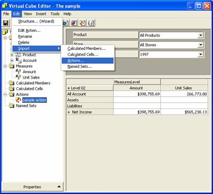In Virtual Cube Editor, on the Edit menu, point to Import, and then click Actions.