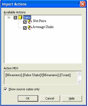 In the Import Actions dialog box, select the check box beside the action, and then click OK. (To select all the actions in a cube, select the check box beside the cube.)