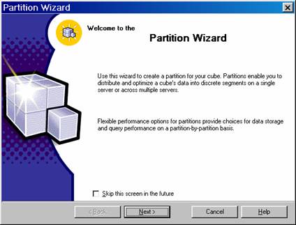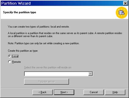 Every cube must contain at least one default partition. The partition is created when the cube is created. The Partition Wizard can be used to create additional partitions. The partition can use the same data source or derive its data from a different data sources.