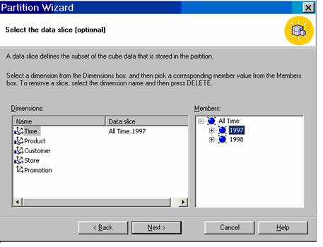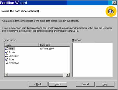 Let us say we want a partition that will give us details of sales in 1997. Let us select sales_fact_1997 as the fact table from the data source FoodMart 2000 database. Now we are prompted to select the data slice. A data slice is a subset of a cube that is stored in the partition.