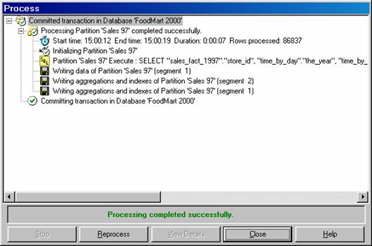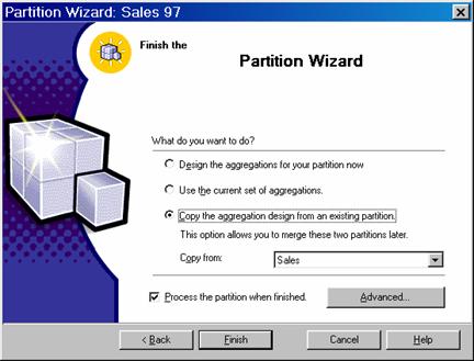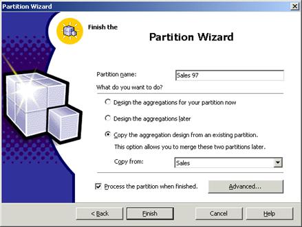 In the Partition name we enter Sales 97 and we decide to copy aggregation design from the existing partitions This type of selection will be useful when the user wants to merge two partitions of a cube. Click Finish. The processing of the cube begins if the ‘Process the partition when finished’ check box is checked. Processing will take some time depending on the size of the data in the partition.