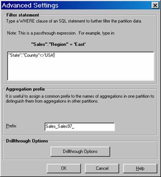 Note that the Aggregation prefix value in the Advanced settings dialog box determines what prefix the Analysis Server uses when creating ROLAP aggregation tables in the relational data source. If ROLAP storage is not being used the aggregation prefix has no impact. The Drill through options button is useful only when drill through has been enabled for the cube.