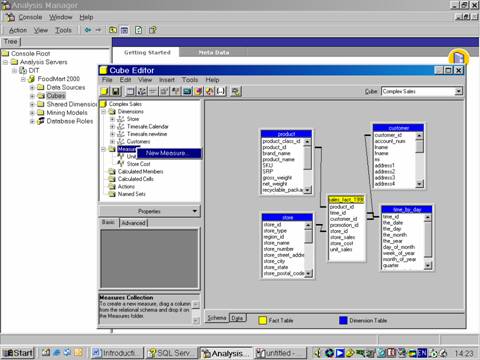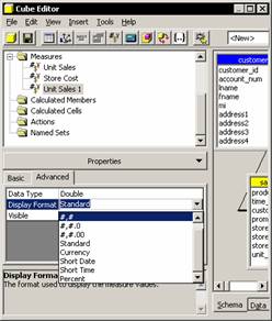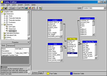 On selecting a measure a source column property appears on the basic tab of the properties pane. This property is similar to the Member Key Column and Member Name Column properties of dimension levels. The property contains the name of the table and a column from the relational data source. The user can enter SQL expressions which are acceptable to the data source.