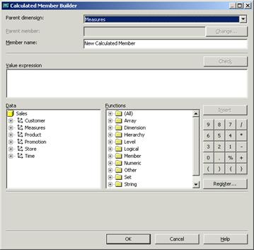 In the cube tree, right click the Calculated Members folder, and click New Calculated Member. The Calculated Member Builder Dialog box opens. The first three boxes determine the dimension’s characteristics of the calculated member: Parent Dimension(the dimensions to which it belongs), Parent member(the parent under which it is attached), and the member name.