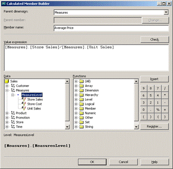 The Parent dimension is set to measures by default. The Parent Member box is disabled because the measure dimension does not support hierarchies. In the Member Name box let us enter Average Price. The lower half of the Calculated Member builder provides all the components necessary for building the calculated member expression. Under Data, expand the measures dimension and then expand MeasuresLevel. The list of measures appears.