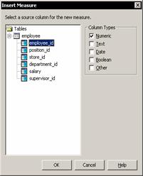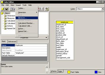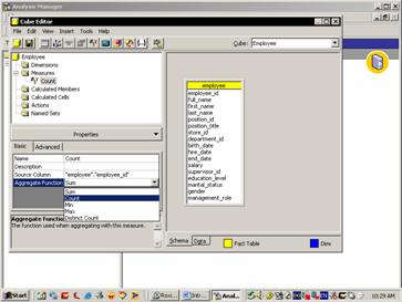 Click the Insert Measure toolbar button, and double click the Employee_Id and type Count for the Name property of the new measure, and change the value of the Aggregate function property to count.