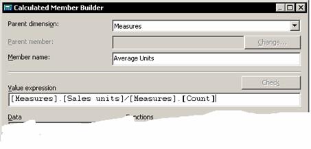 Click the Insert Calculated Member toolbar button. In the Calculated Member builder dialog box type Average Units as the Member name.