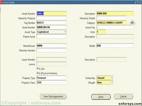Correct an error or update financial and depreciation information for single asset or a group of assets. You can also override depreciation information for an asset while adding it using the Detail Additions process.