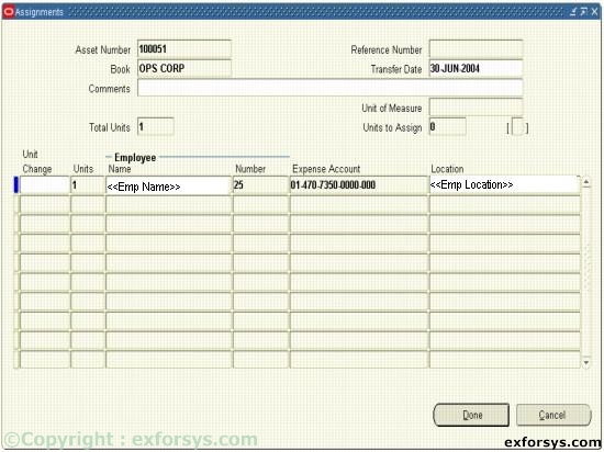 c) You are not retiring these units; you are adjusting the number of units to reflect the correct amount. d) When you save your work, Oracle Assets navigates to the Assignments window so you can update distribution information.