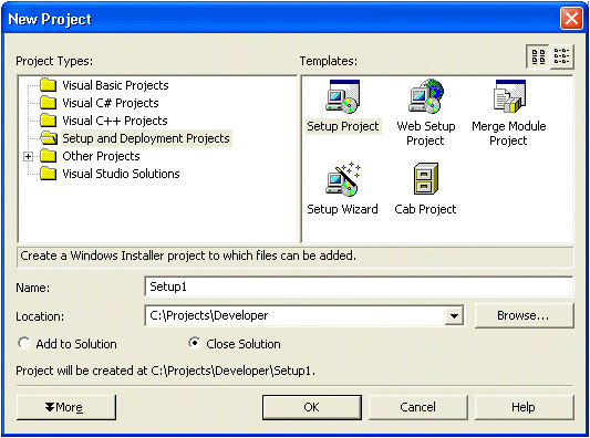 Visual Studio .NET comes bundled with five types of project templates that can be set up and used to deploy .NET applications. These project templates can be accessed in the same way that any other project in Visual Studio .NET is accessed, by using the File | New Project dialog box.