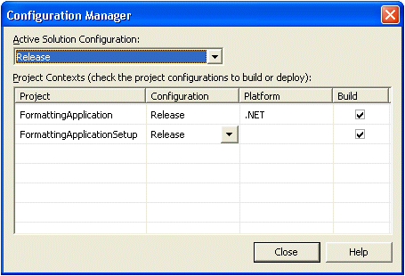 Once an application is created, its deployment related properties can be configured. To configure, the user has to right click the FormattingApplicationSetup project from the Solution Explorer and select properties and then selecting Build. The configuration manager dialog box, then, helps the user change the Active solution configuration setting from Debug to Release for both projects to create a release build.