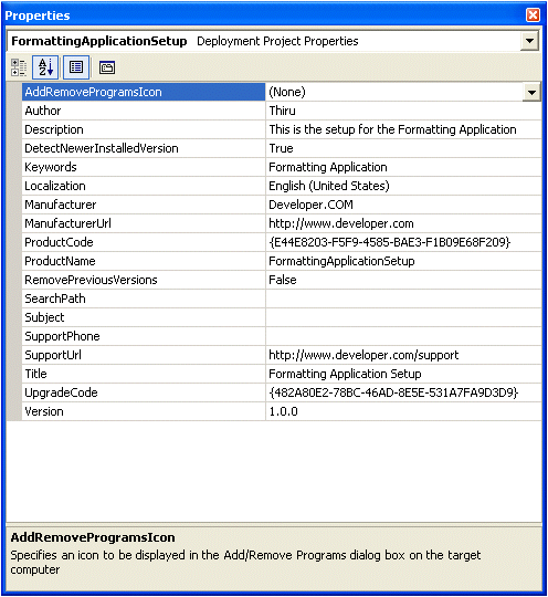 Certain deployment specific properties have to be set at a global level. These properties can be accessed through the properties window. The Add/Remove Programs icon settings, the Author settings, installation description settings, the keyword settings, the Detect newer installed version settings, remove previous versions settings, Manufacturer settings and so on will have to be specified.